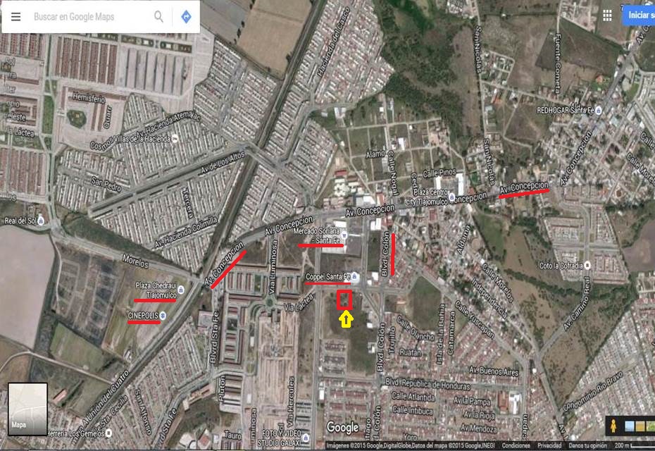 Terreno comercial en venta ideal para un centro comercial o franquicias ya que cuenta con 38 metros de frente por 58 metros de fondo. El terreno está a un lado del supermercado "SU SUPER" y en frente de "COPPEL Santa Fe" y a media cuadra de "SORIANA Santa Fe" los cuales les sirve de referencia del potente mercado comercial de la zona